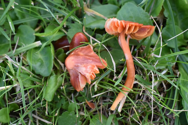 These are two new species split from the Parrot waxcap and used to be called Hygrocybe psittacina var. perplexa. However as there are (at least) two species in what was called perplexa, we do not know what the older records were of. They are close together. Gliophorus aff. perplexus is known as G. sciophanus on iNaturalist and Peachy Steve’s app but the Kew paper did present a long arguement why this is an invalid name. They are both very slimy. G. europerplexus or the Butterscotch waxcap has a apricot brown cap while G. aff. perplexus has a more toffee apple colour. We have two confirmed records of G. europerplexus from Knockdhu and Galboly and one of G. aff. perplexus from Rathlin.