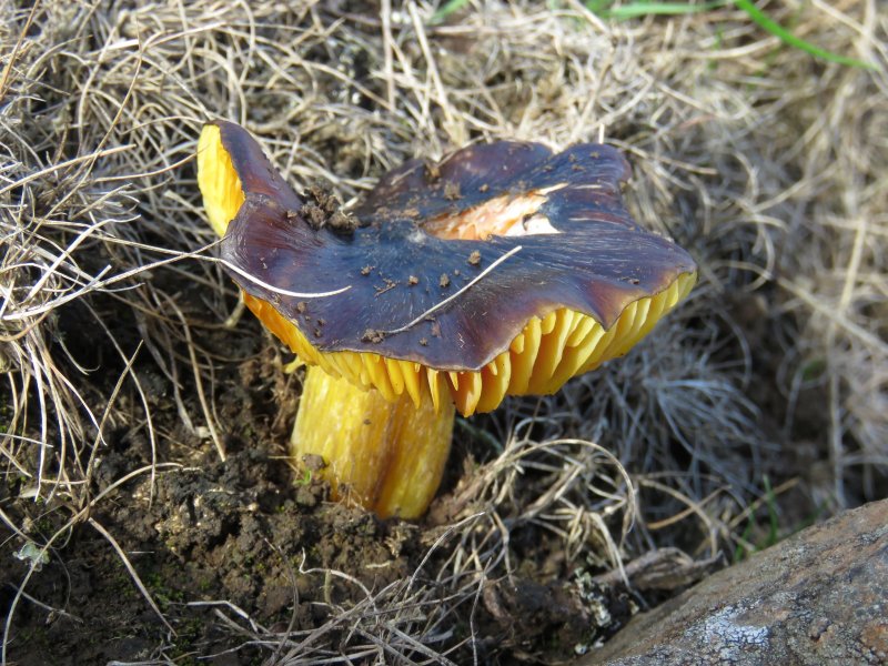 A very distinctive species with a date brown cap and bright yellow gills. Only two Irish records with the bizarre distribution of Rathlin Island and Inishbofin, two of Ireland’s extremities.
